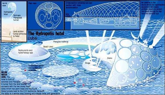 Currently under construction in Dubai, Hydropolis is the world's first luxury underwater hotel. It will include three elements: the land station, where guests will be welcomed, the connecting tunnel, which will transport people by train to the main area of the hotel, and the 220 suites within the submarine leisure complex. It is one of the largest contemporary construction projects in the world, covering an area of 260 hectares, about the size of London's Hyde Park.Click Here For More Details.